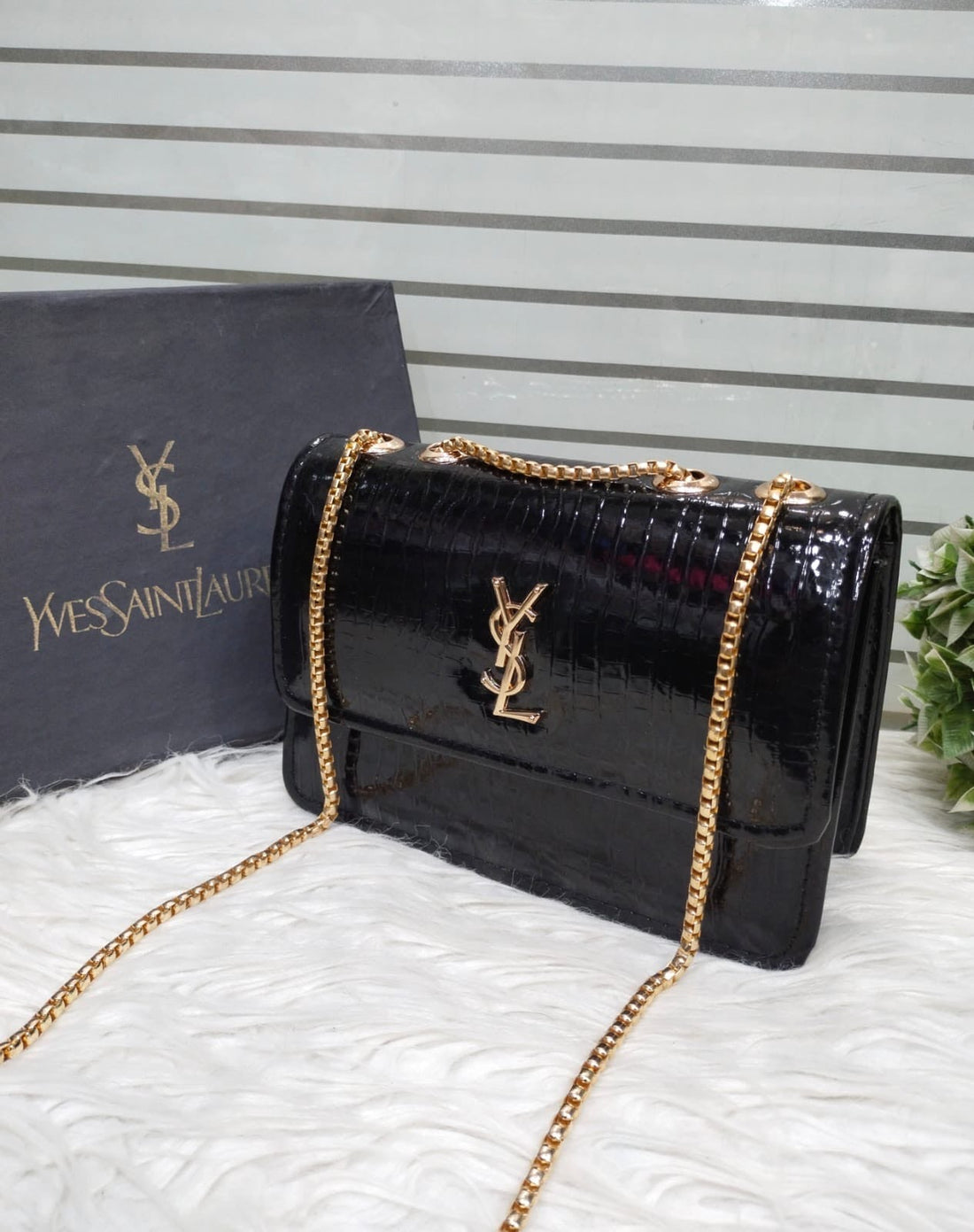 black, crocodile-embossed leather crossbody bag featuring the iconic YSL (Yves Saint Laurent) logo in gold-tone hardware.