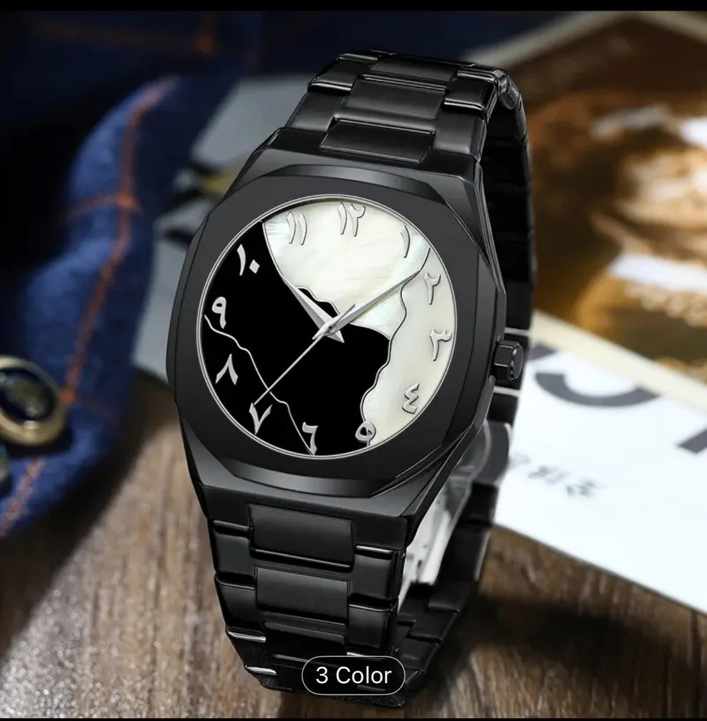 Arabic Dial Black Watch from Sada Store, a sleek and sophisticated timepiece that merges minimalist design with cultural charm. This elegant watch features a 42mm matte black dial, accented with white Eastern Arabic numerals, providing a striking contrast for effortless readability and a unique aesthetic. The angular stainless steel case, paired with a matching black stainless steel bracelet, exudes modern sophistication, making it a versatile accessory for both formal and casual settings.Powered by a precise quartz movement, this watch ensures dependable timekeeping. With 50-meter water resistance and a durable mineral crystal, it’s crafted for everyday wear, offering resilience and style in equal measure. The luminous hands enhance visibility in low-light conditions, while the solid case back maintains its streamlined, polished look. Included with the watch is a handy bracelet adjustment tool, ensuring a perfect fit right out of the box.Exclusively available at Sada Store, this Arabic dial watch is a perfect blend of heritage and contemporary design, ideal for those who appreciate understated elegance and functionality.Key Features:Dial: Matte black with white Eastern Arabic numeralsCase: 42mm stainless steel, angular designMovement: QuartzBracelet: Black stainless steelWater Resistance: 50mCrystal: MineralAdditional: Luminous hands, bracelet adjustment tool includedWarranty: Manufacturer’s warranty includedShop now at Sada Store and elevate your style with this Arabic Dial Watch, where timeless design meets modern precision.